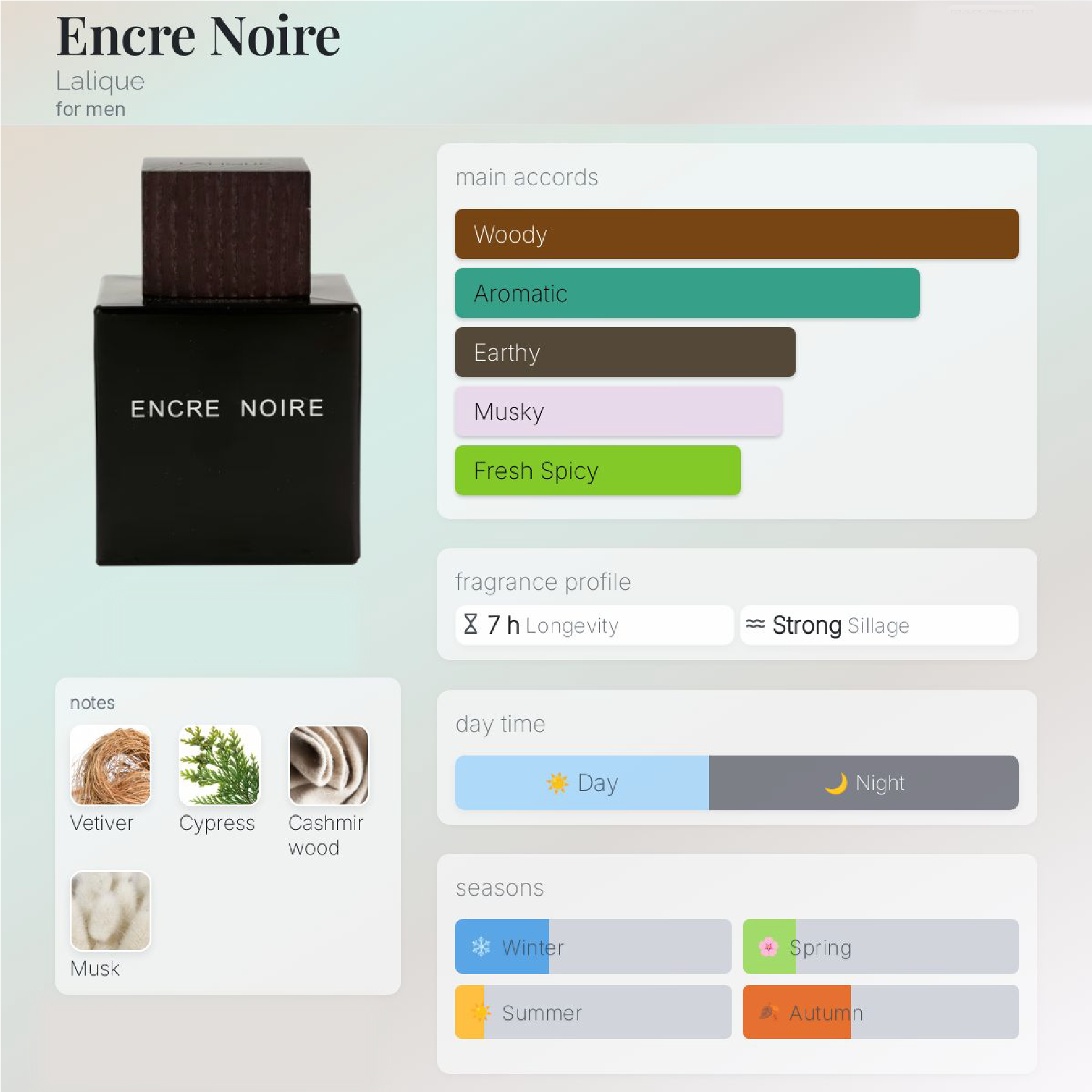 در کل این ادو تویلت بویی مثل رایحه‌ی چوب سوخته از خود به جا می‌گذارد. خط نت‌های این عطر، حتی وقتی از محیطی که در آن بودید خارج می‌شوید، همچنان حس می‌شود. لالیک انکر نویر با فرمولاسیون و طراحی این ادو تویلت در سال 2006 توسط عطرساز مشهور «ناتالی لورسن» (Nathalie Lorson) انجام شده است. با نگاهی به بطری مکعبی و زیبای لالیک انکر نویر، متوجه شباهت آن به شیشه‌ی جوهر خوش‌نویسی یا به عبارت رایج‌تر، مرکبدان خواهید شد. پس بی‌دلیل نیست که اسم آن را به زبان فرانسوی Encre Noire انتخاب کرده‌اند. در بطری مکعبی به رنگ و شکل چوب است که با ایهامی زیبا و گویا، حال و هوای تلخ و چوبی این عطر را بازگو می‌کند. روی شیشه نام Encre Noire انکر نویر با رنگ سفید خودنمایی می‌کند. تمام این ویژگی‌ها، دلایلی است که این عطر را در میان ده عطر پرفروش تاریخ قرار داده‌اند. نام این محصول Encre Noire به معنای جوهر سیاه است و از طراحی ظاهرش نیز چنین برداشتی می‌شود.لالیک انکر نویر با این همه موارد خاص دارای نت و رایحه های زیر است.