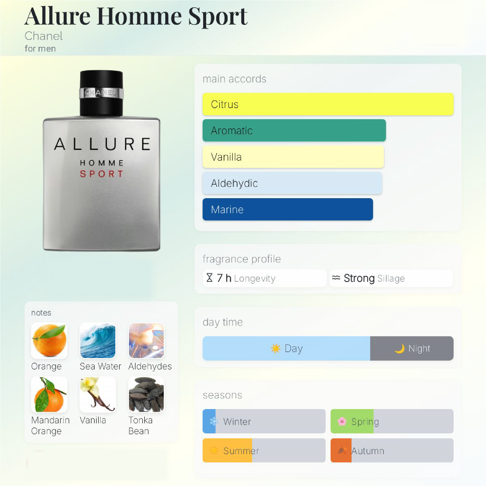 به تفکیک نتهای اصلی وتشکیل دهنده آلور هوم اسپرت Allure Homme Sport را در جدول زیر شرح میدهیم که عطر شهر این ادکلن را به شما عزیزان پیشنهاد میکند .