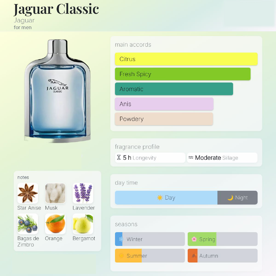 جگوار کلاسیک این عطر جاص مردانه که بسیار جذاب است برای مردان خوشپوش از رایحه ها و نت های زیر تشکیل شده.